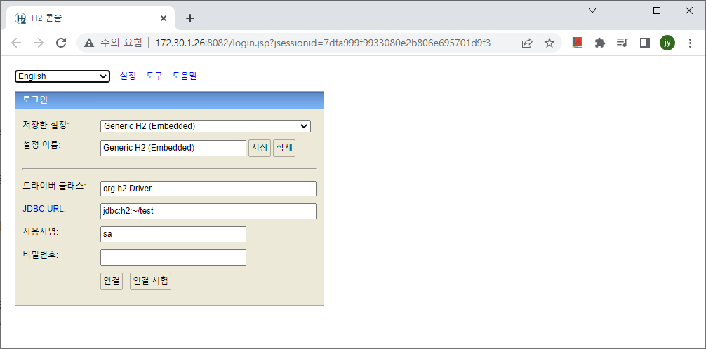 - 이후부터는 JDBC URL 수정후 아래의 주소 또는 https://localhost:8082 로 접속 (네트워크 모드)